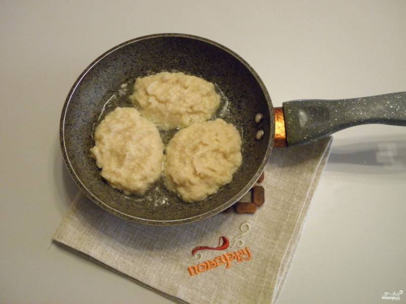 Столовой ложкой набирайте фарш и выкладывайте в горячее масло, формируя при этом котлетку круглой или овальной формы.