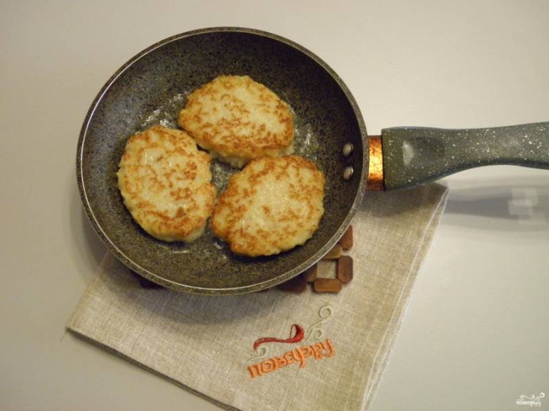 Когда рыбные котлеты поджарятся до румяной корочки с одной стороны, их легко можно перевернуть двумя вилочками на другую сторону и обжарить до готовности. Готовые котлетки снимите с огня и горячими подайте к столу. Приятного аппетита!