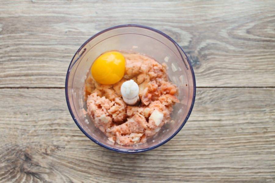 Репчатый лук порежьте и обжарьте на сливочном масле в течение 5 минут на среднем огне. Выложите в чашу блендера филе и обжаренный лук, пробейте до однородности. Разбейте туда яйцо. Все еще раз пробейте блендером.