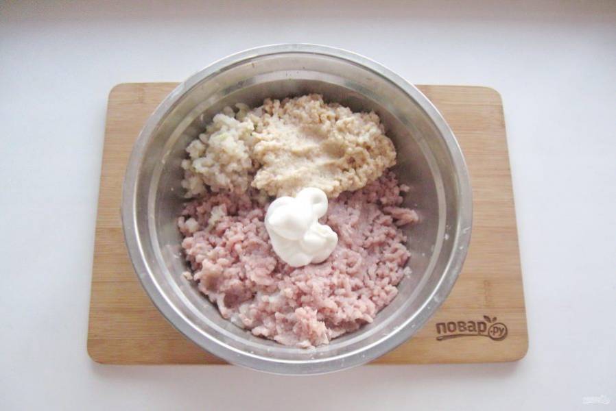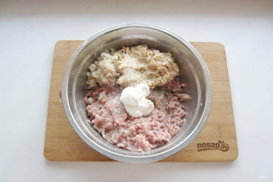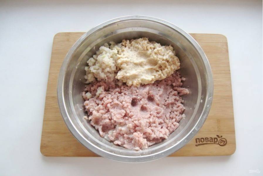 Батон залейте холодной водой и отожмите. Репчатый лук очистите, помойте. Пропустите через мясорубку филе, батон и лук.