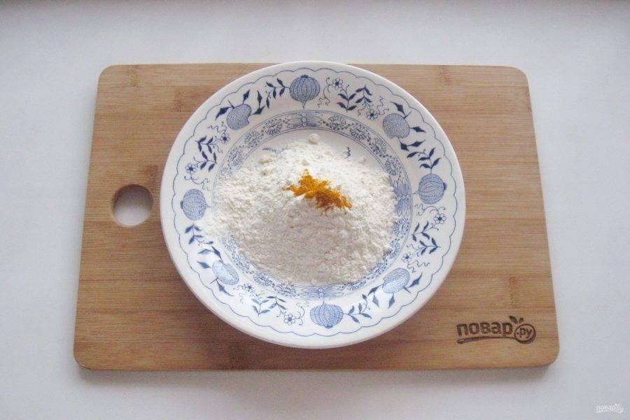 В тарелку насыпьте муку, добавьте молотую куркуму.