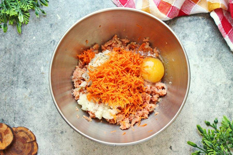 Репчатый лук измельчите любым удобным способом, я просто натираю на крупной терке. Выложите лук в фарш с яйцом.
