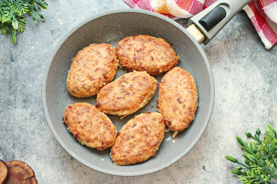 Обжаривайте котлеты с двух сторон на среднем огне до золотистой корочки и готовности. На это уйдет примерно по 5 минут с каждой стороны. Готовые рыбные котлеты снимите с огня и сразу подавайте на стол с любым гарниром.