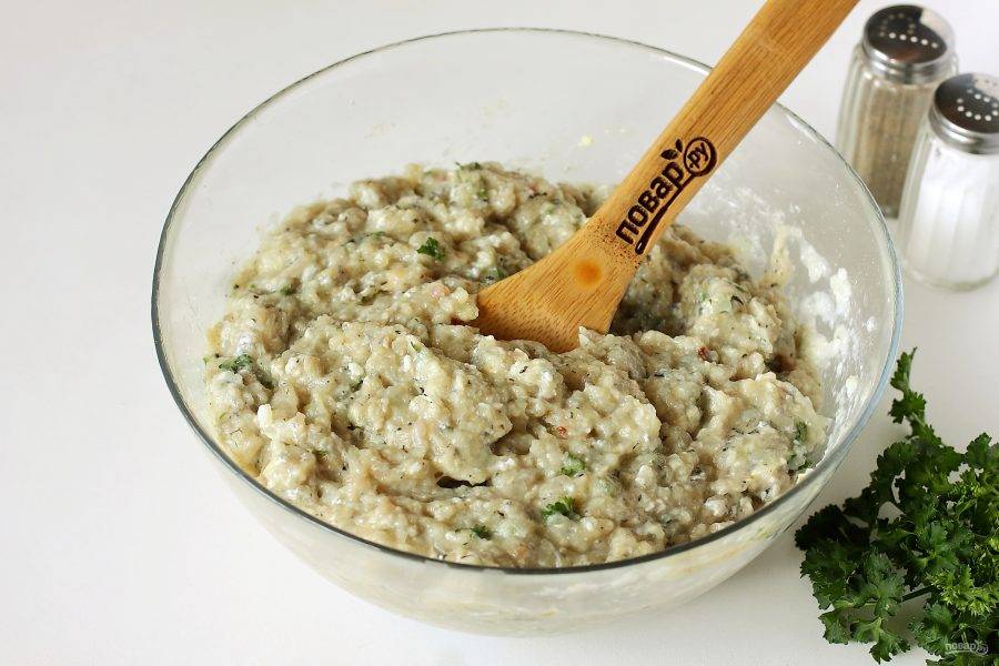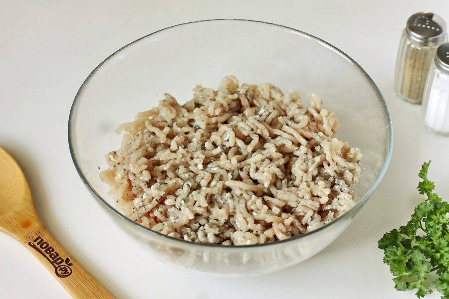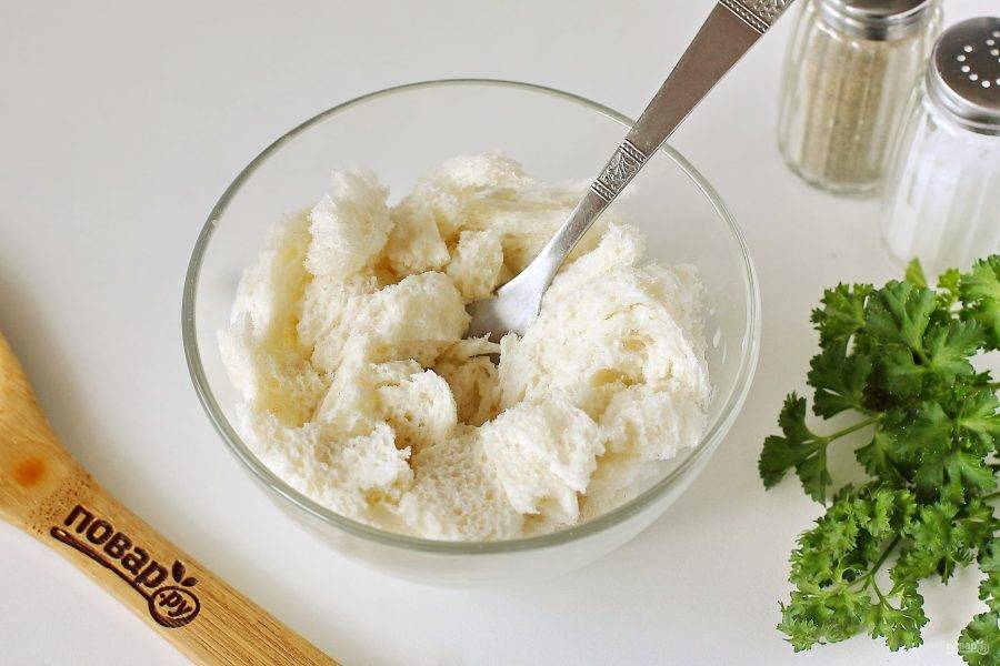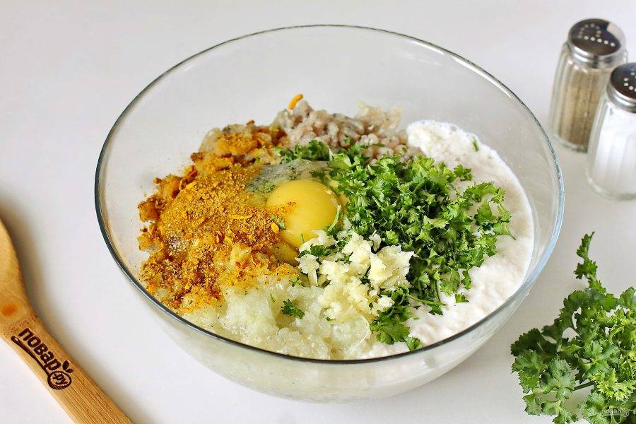Добавьте к готовому фаршу яйцо, прокрученный через мясорубку лук, замоченный хлеб, измельченную зелень, пропущенный через пресс чеснок, соль, перец и специи по вкусу.
