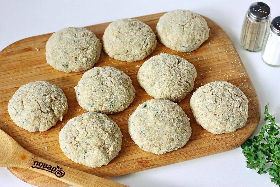 Сформируйте котлеты и обваляйте их со всех сторон в сухарях.