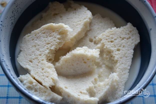 Затем выкладываем ломтики хлеба в глубокую миску и заливаем молоком.