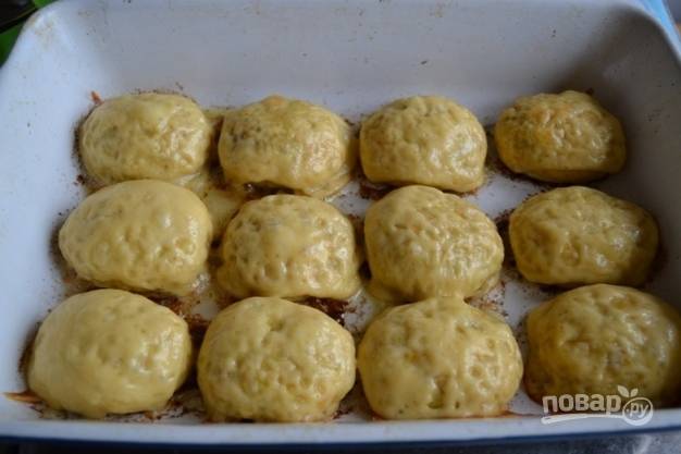 Затем выкладываем на каждую котлету тонкий ломтик сыра и снова отправляем в духовку на 5-10 минут.