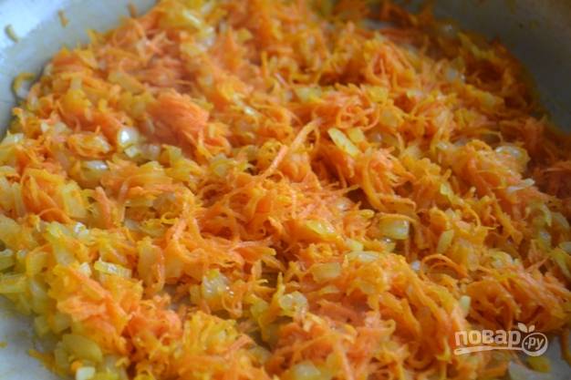 Затем на растительном масле немного обжарим лук и морковь, пусть остывают.