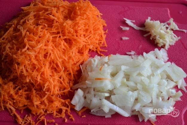 Морковку и чеснок натираем на мелкой терке, а репчатый лук нарезаем мелкими кусочками.