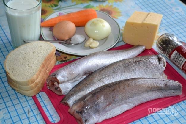 Подготовим все продукты для приготовления рыбных котлет в сырной шубке. Тушки хека предварительно разморозим, почистим лук, чеснок и морковь.