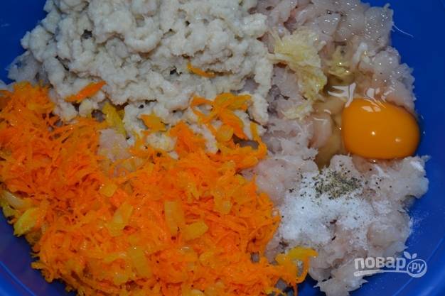 Филе хека вместе с отжатым хлебом измельчаем в мясорубке. Добавляем к нему яйцо, соль, лук с морковкой, перец и чеснок.
