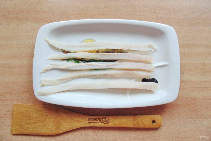Филе рыбы помойте и нарежьте длинными полосками шириной 1,5-2 сантиметра.