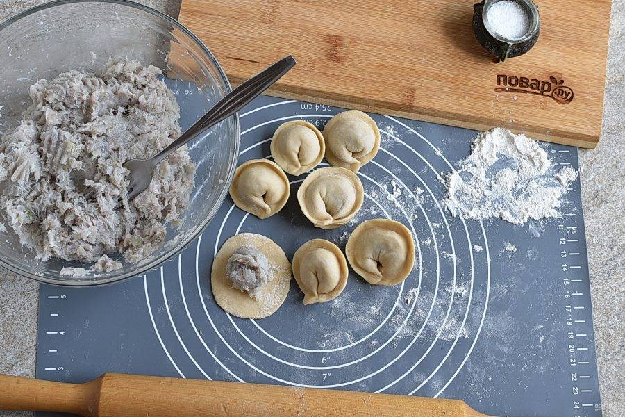 Выкладывая по чайной ложке фарше, слепите небольшие пельмешки.