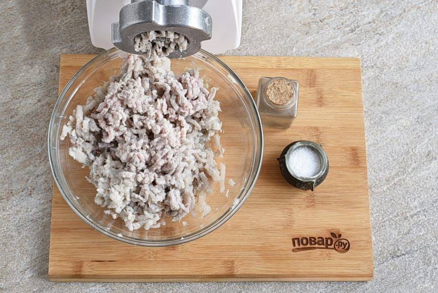 За это время приготовьте фарш. Рыбное филе пропустите через мясорубку со средней решеткой, вместе с очищенной луковицей и свиным салом.