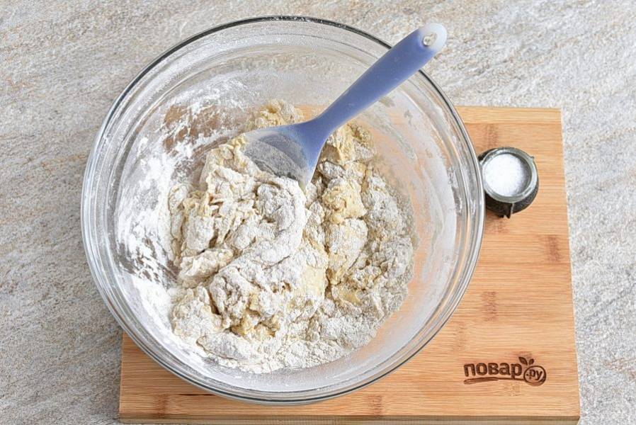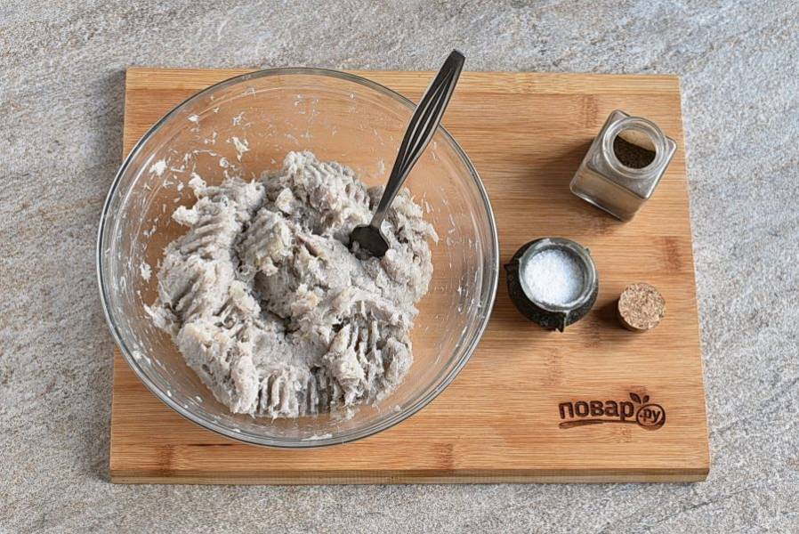 Посолите, щедро поперчите и хорошо вымешайте фарш. Уберите в холодильник, пока тесто отлеживается.