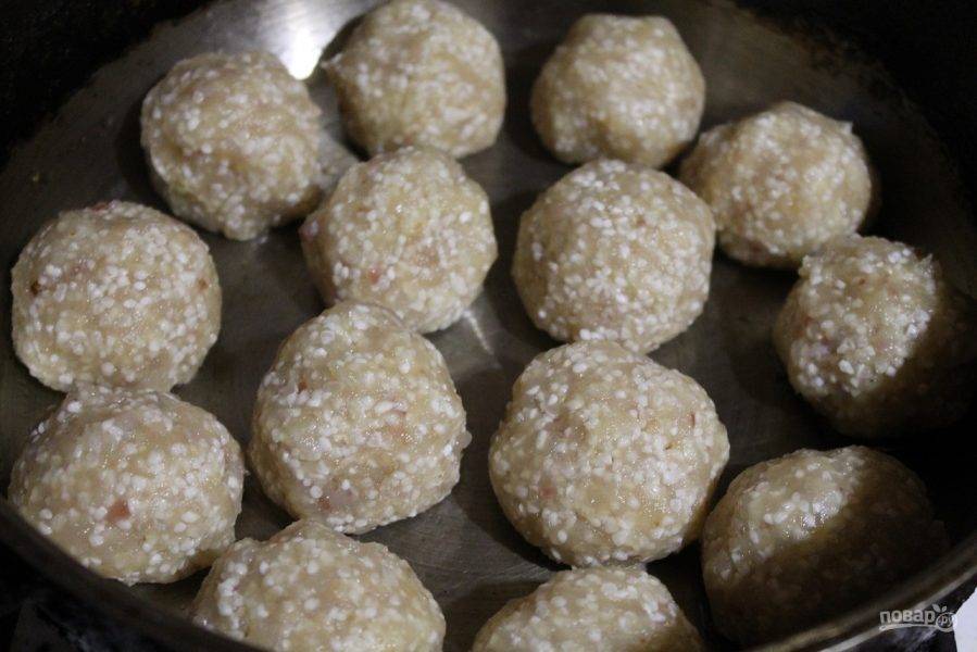 Разогретую сковороду смажьте растительным маслом. Из подготовленного фарша сделайте тефтели. Выложите в сковороду.