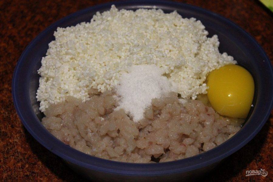 В чашку выложите рыбный фарш, молотый лук, яйцо, рис и соль.