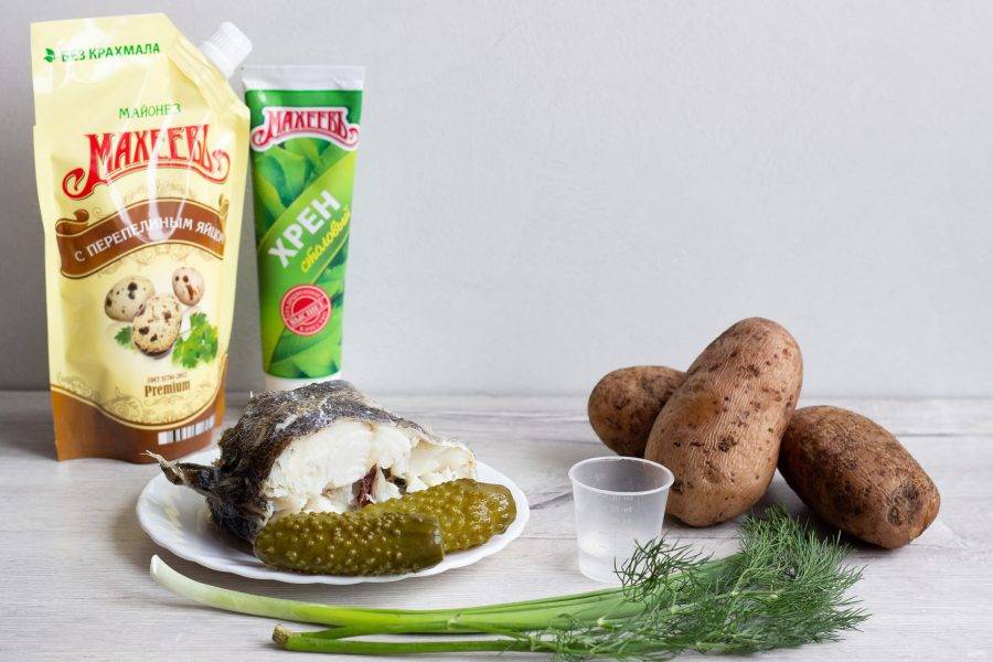 Подготовьте все необходимые ингредиенты. Продукция от ТМ Махеевъ всегда под рукой и выручает! Рыбу нужно заранее отварить в подсоленной воде с перцем-горошком и с лавровым листом. Варите 12-15 минут в кипящей воде и оставьте в бульоне до полного остывания. Затем отделите филе от костей и кожи.
