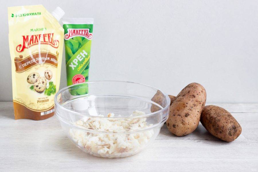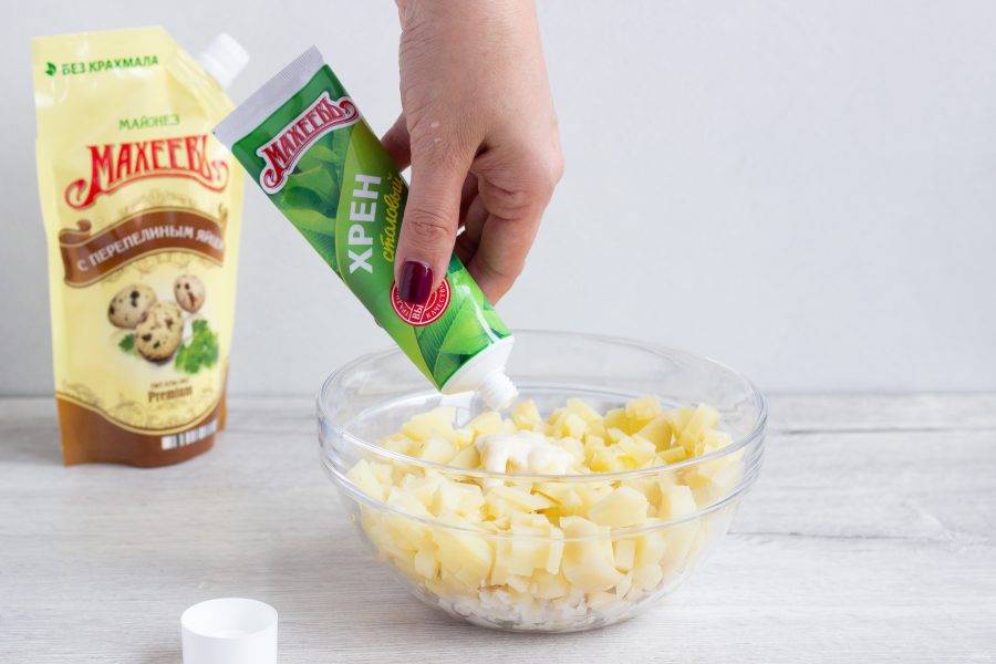 Вареный картофель очистите, нарежьте небольшими кубиками и добавьте к рыбе. Также добавьте уксус и хрен, перемешайте и дайте настояться 15-20 мин.
