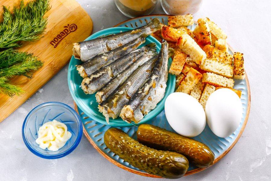 Вкусный рыбный салат с сухариками можно подать в будни или на праздничный стол. Сухарики вы можете приготовить самостоятельно, а вот рыбку лучше приобрести копченую, соленую или в консервах.