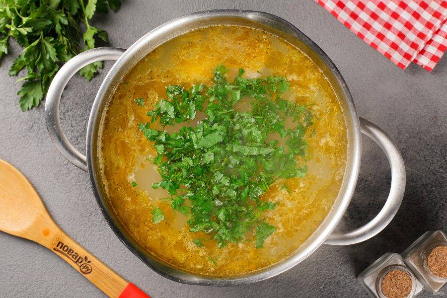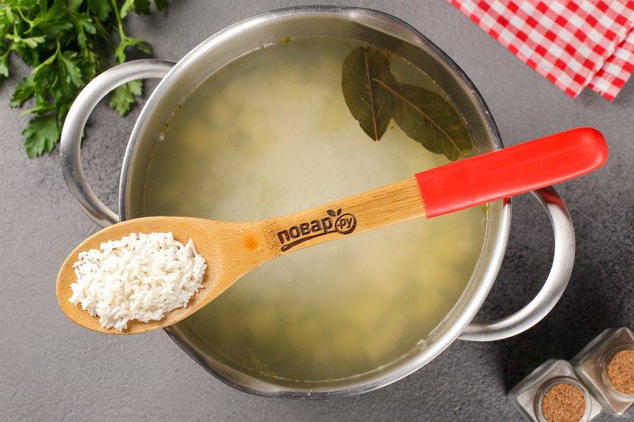 Затем добавьте промытый рис и варите ещё 10 минут.