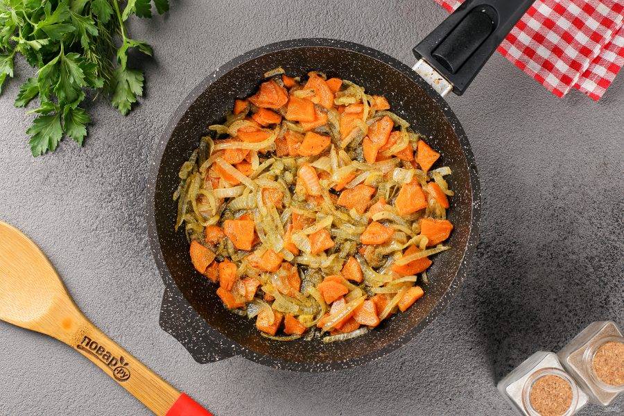 Тем временем разогрейте сковороду с маслом, выложите нарезанные произвольно лук и морковь, добавьте специи по вкусу и обжарьте в течение 5 минут.