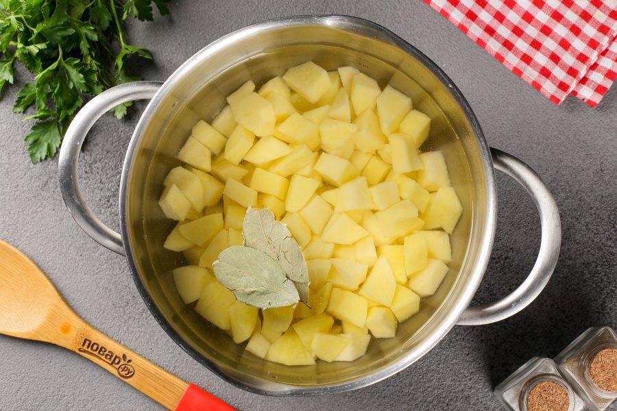 Картофель нарежьте кубиками и выложите в кастрюлю. Добавьте воду и лавровый лист. Поставьте на огонь и после закипания варите 5 минут.