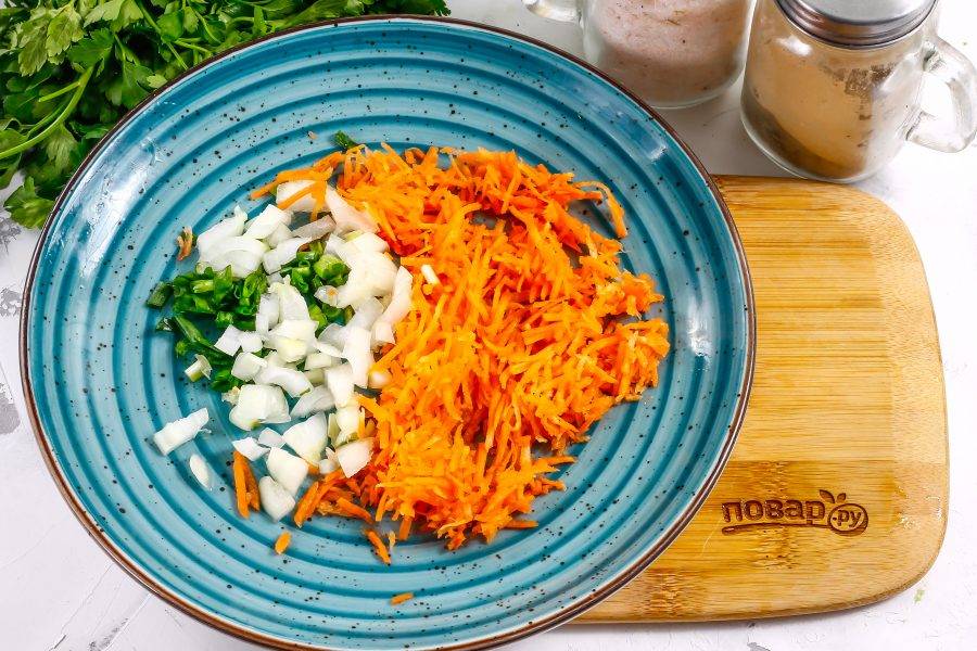 Морковь и лук очистите от кожуры, промойте в воде и натрите морковь на терке с мелкими ячейками, а лук нарежьте мелким кубиком.