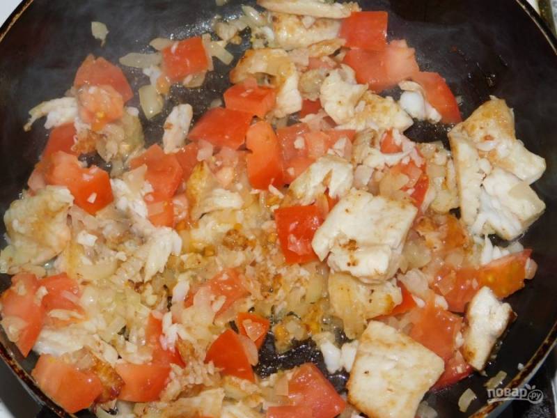 Добавьте нарезанные помидоры. Обжарьте все вместе пару минут, чтобы помидоры пустили сок.