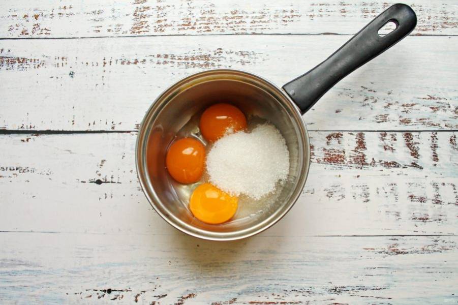 В сотейник с толстым дном выложите яичные желтки и сахар.