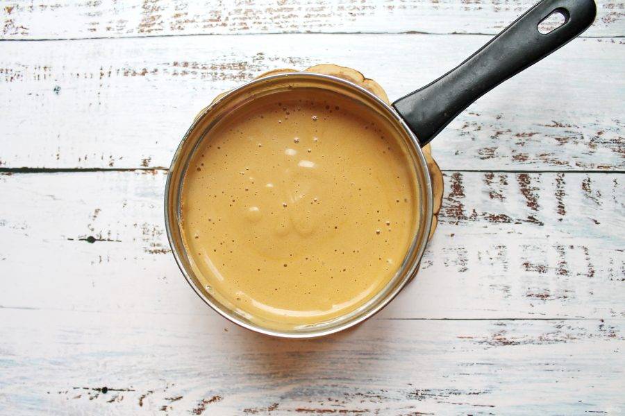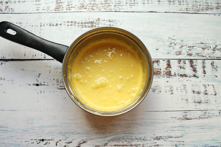 Установите сотейник с кремом на водяную баню и прогревайте массу, все время, взбивая венчиком. Масса должна стать однородной, густой, но оставаться нежной. На все это уйдет примерно 5-6 минут. Снимите с водяной бани и полностью остудите.