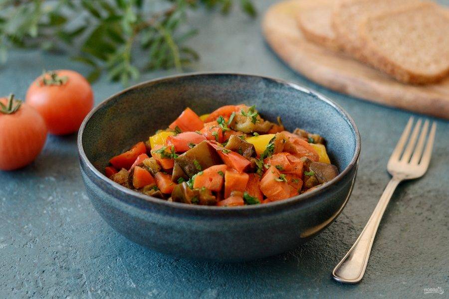 Разложите сабджи с баклажанами по тарелками и украсьте мелко порубленной зеленью. Приятного вам аппетита!