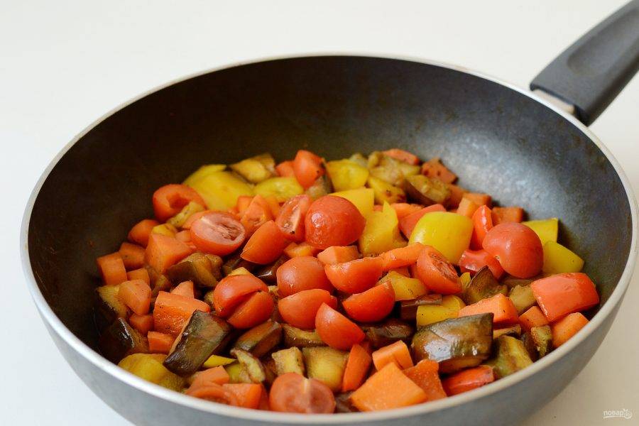 Затем добавьте порезанные пополам помидоры черри. Тушите овощи еще 6-8 минут. Снимите с плиты и дайте постоять 5-10 минут.