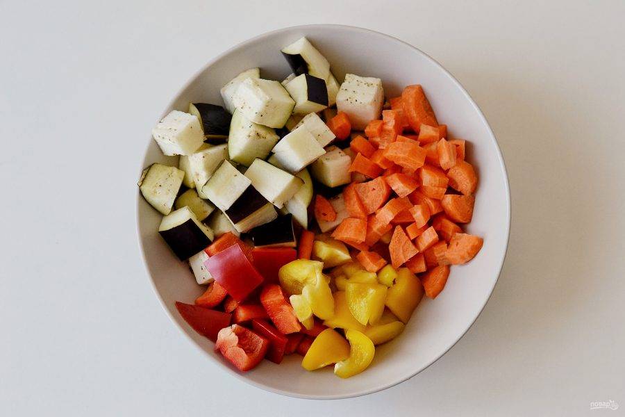 Для начала подготовьте овощи. Морковь очистите от кожуры, затем нарежьте все овощи (кроме помидоров) крупными кубиками.