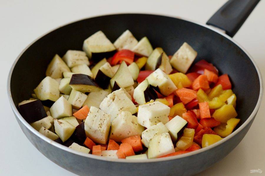 Добавьте морковь, перец и баклажан. Обжаривайте овощи на среднем огне 10 минут.