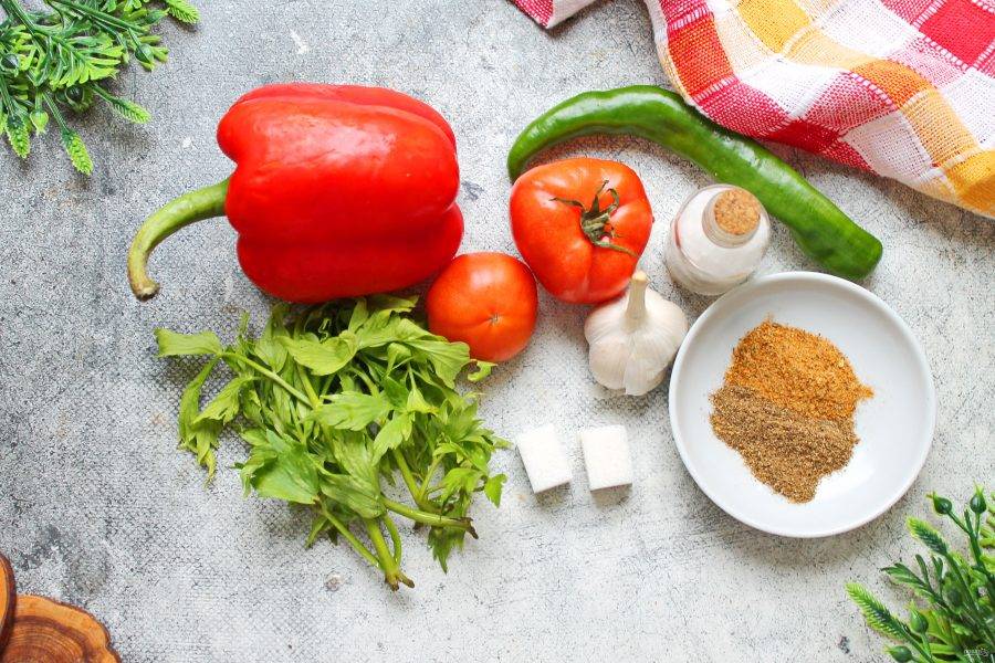 Подготовьте все необходимые ингредиенты для приготовления сацибели на зиму. Овощи тщательно помойте и дайте обсохнуть, зелень сполосните, стряхните воду или обсушите бумажным полотенцем.