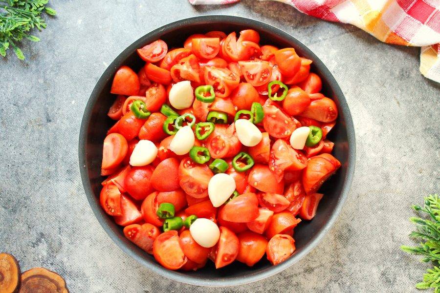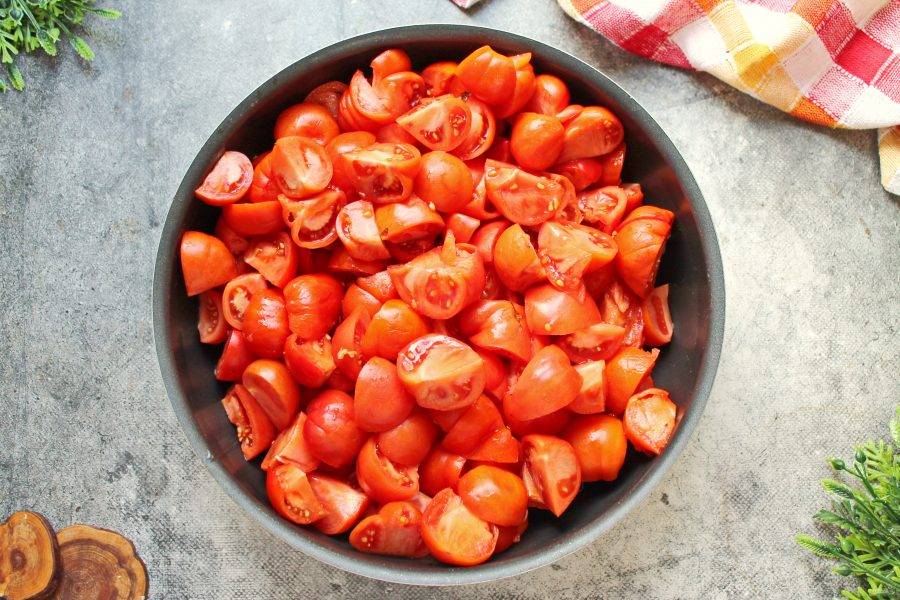 У помидоров отрежьте кончики и порежьте на куски, выложите в глубокую кастрюлю с толстым дном.