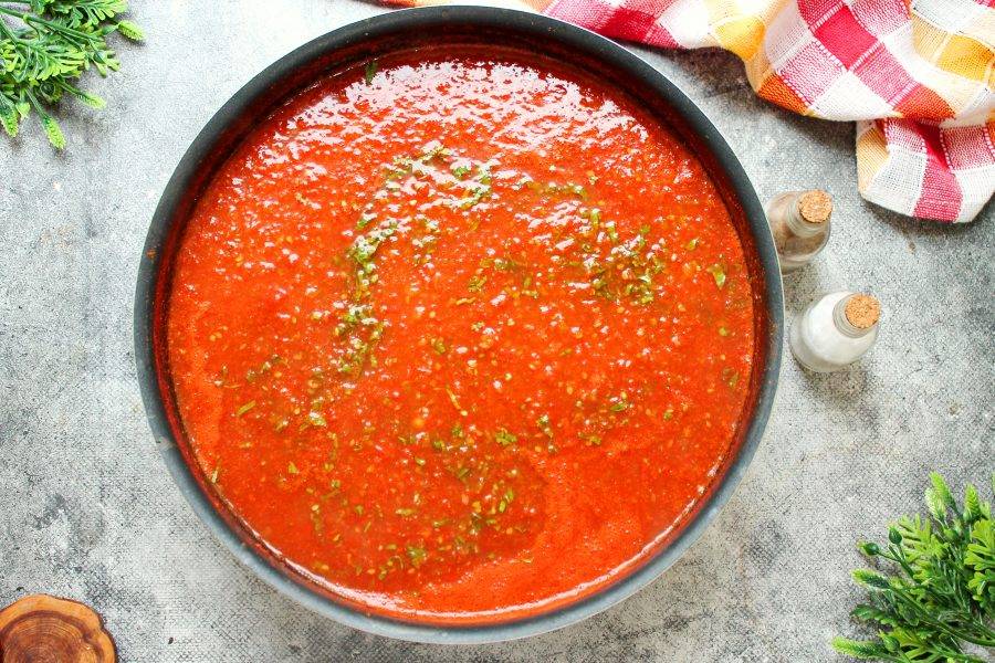 Добавьте специи и варите массу в течение 8-10 минут, на среднем огне, перемешивая.