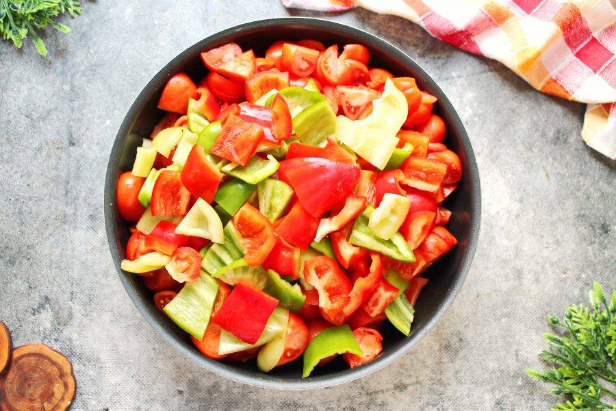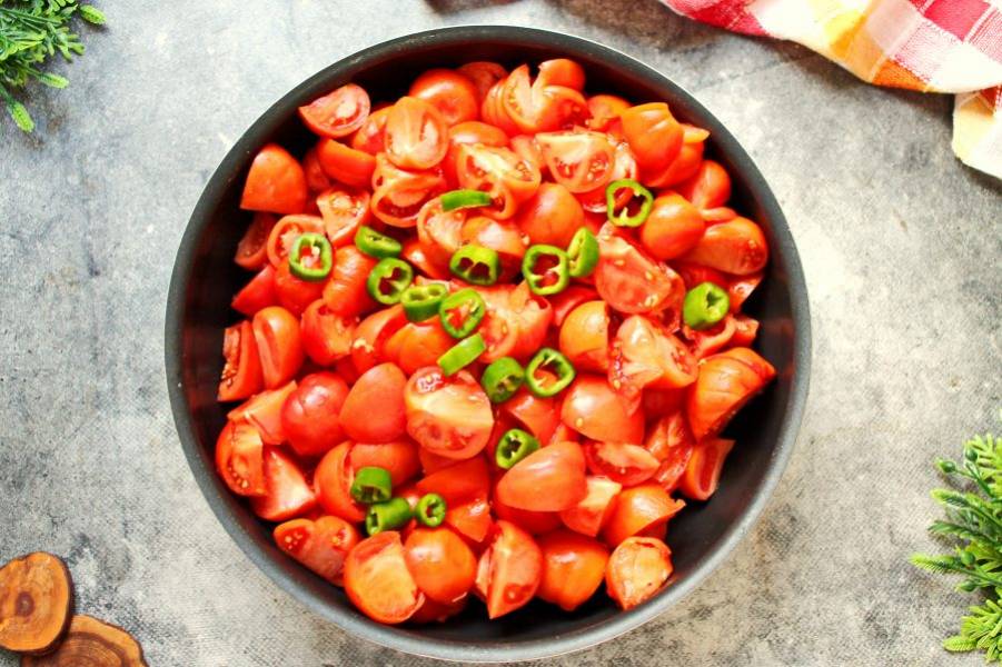 У острого перца отрежьте кончики, удалите семена, порежьте на кусочки и выложите к помидорам.