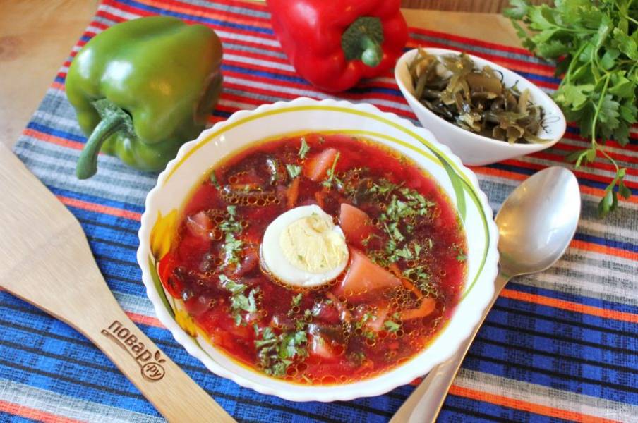 Подавайте борщ к столу с отварным яйцом. Любители сметаны могут добавить её.