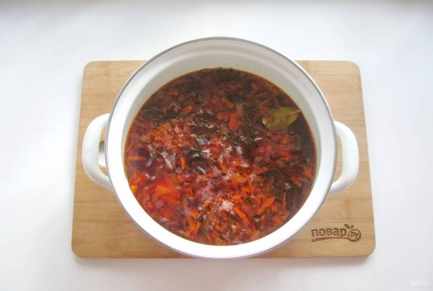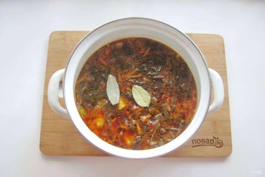 Выложите лавровый лист. Варите борщ еще 8-10 минут и выключайте.