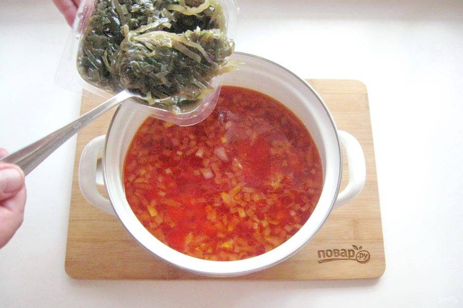 Помидоры измельчите в мясорубке или блендере. Можно натереть на терке. Добавьте в борщ. Посолите и поперчите по вкусу.