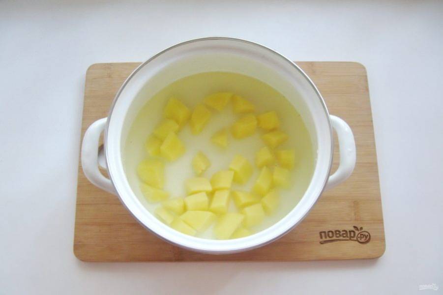 В кастрюлю налейте бульон и выложите нарезанный кубиками картофель.