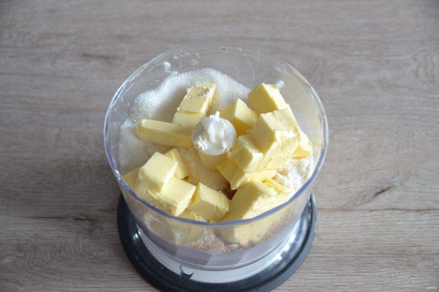 Добавьте порезанное кубиком охлажденное сливочное масло, пробейте в крошку.
