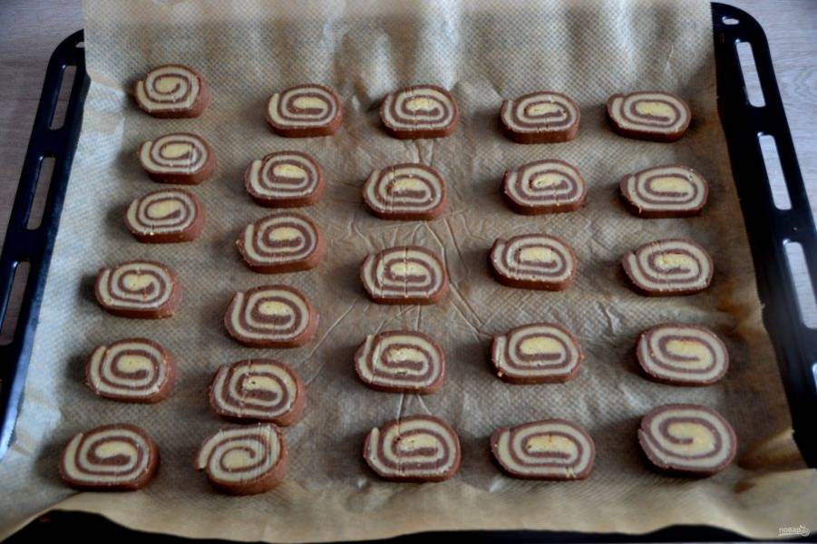 Нарежьте охлажденное тесто на ломтики толщиной примерно в 1 см. Выложите на лист для выпечки, выпекайте печенье при температуре 180 градусов 15-20 минут.