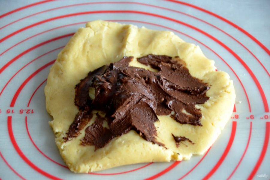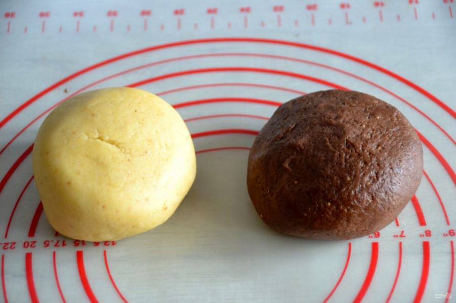 Выложите какао-массу на одну из частей и вмешайте в тесто до однородности.