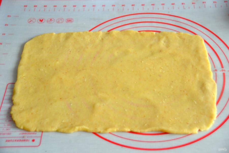 Раскатайте светлое тесто в тонкий прямоугольный пласт толщиной примерно 3 мм.