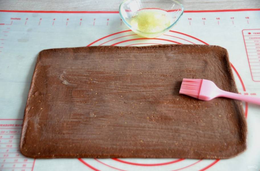 Раскатайте тесто с какао в прямоугольный пласт такого же размера, как из светлого теста. Смажьте тесто яичным белком и выложите на него ранее раскатанный светлый пласт. Можно чередовать пласты и наоборот, это не имеет значения.