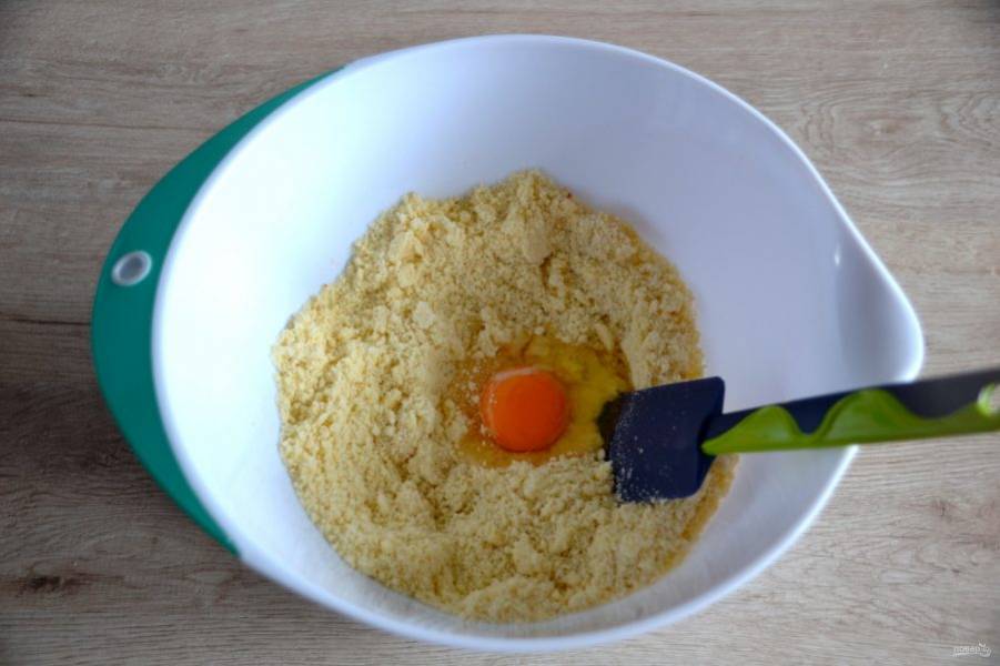 Добавьте в песочную крошку яйцо, замесите тесто.