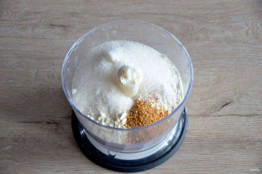 Приготовьте песочное тесто. Выложите в чашу блендера муку, соль, сахар, ванильный сахар, лимонную цедру.